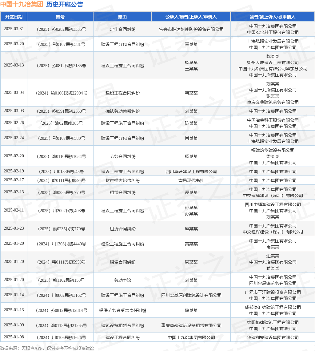 案号:(2025)渝02民终385号审理法院:重庆市第二中级人民法院案由:建设工程施工合同纠纷当事人信息: 原告/上诉人:陈某某 被告/被上诉人:中国冶金科工股份有限公司、中国十九冶集团有限公司开庭日期:2025年2月26日根据统计,近一年内以中国十九冶集团有限公司为当事人的历史开庭公告有208则,其中案由为“建设工程施工合同纠纷”的公告以48则居首,其次为“建设工程分包合同纠纷”有29则,“劳动争议”有23则。历史开庭公告(前20条)如下: